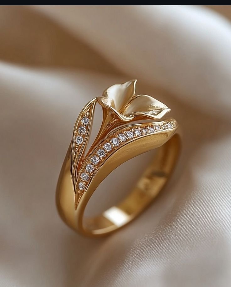 This exquisite ring features a beautifully sculpted golden floral design, resembling a delicate lily or calla bloom. The graceful petals are crafted from highly polished gold, flowing down the shank. One side of the band is elegantly accented with a sweep of pavé-set brilliant white diamonds, adding a radiant sparkle to the modern, organic silhouette. It’s a sophisticated statement piece where nature-inspired artistry meets luxurious brilliance.